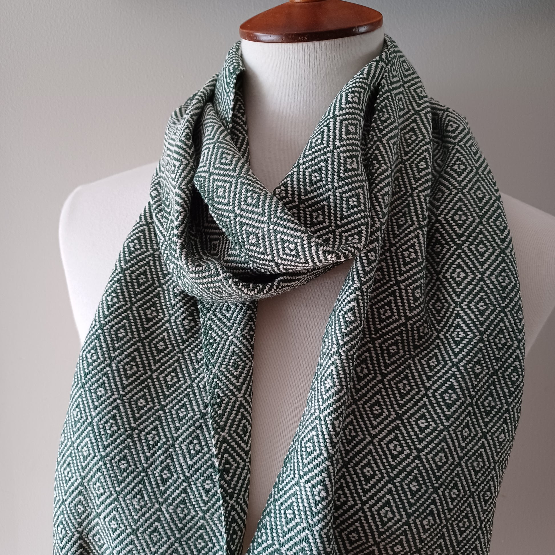This handwoven cotton scarf features a unique diamond pattern and twisted fringe, making it the perfect addition to any winter wardrobe. Its dark green and white color combination adds a touch of sophistication, while its soft texture keeps you warm and cozy.