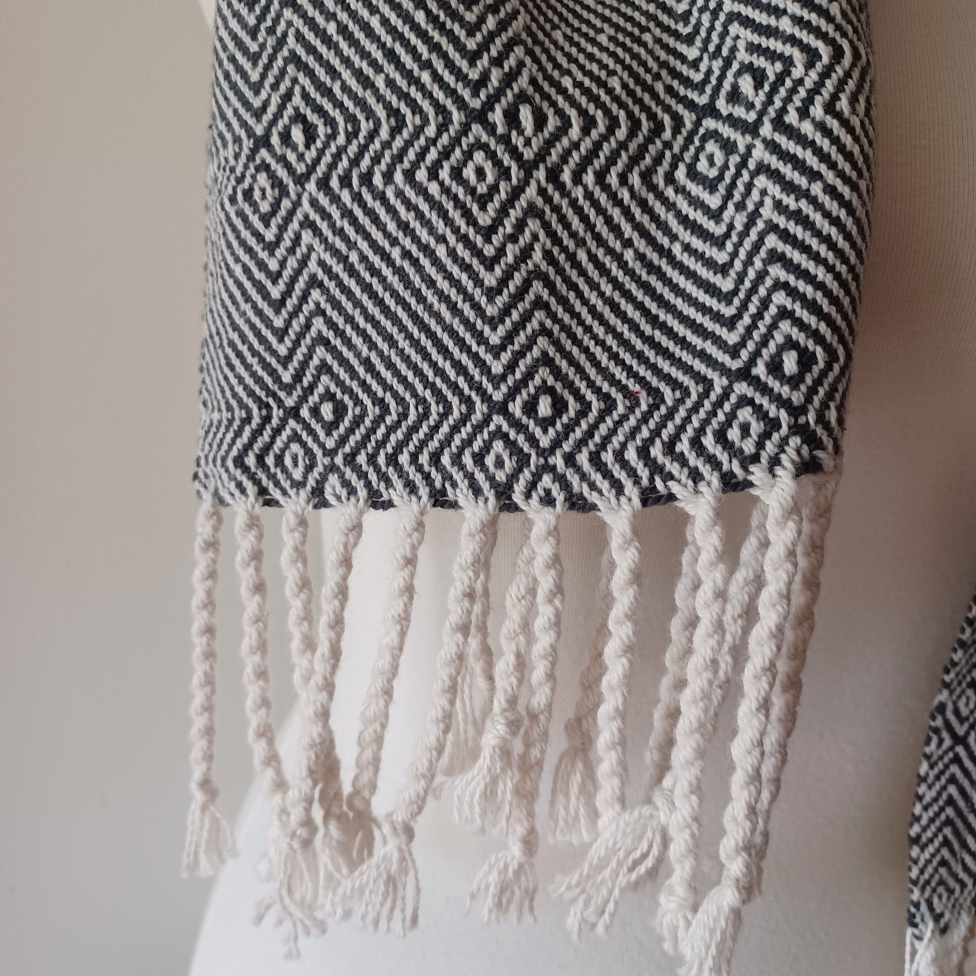 Cozy up with this playful black and white scarf, crafted from organic cotton and handwoven for a one-of-a-kind look. Its thicker weave keeps you warm while the unique design adds a stylish pop to any outfit. Perfect for adding a little fun to chilly days!